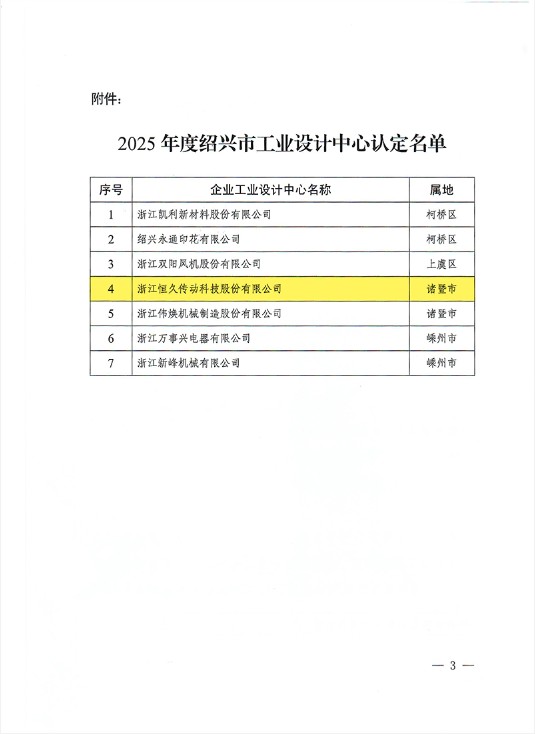 Recently, Zhejiang Hengjiu Transmission Technology Co., Ltd. successfully passed the 2025 Shaoxing Municipal Industrial Design Center certification issued by the Shaoxing Municipal Bureau of Economy and Information Technology.